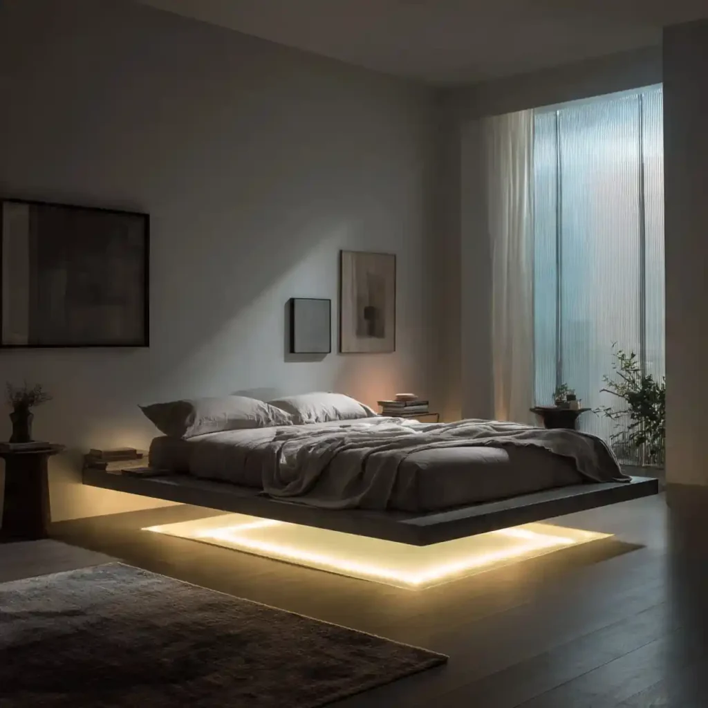 A bed designed to appear floating creates a surreal and modern look. Hidden lighting enhances the floating effect beautifully. Clean lines keep the space minimal and open. Neutral tones maintain a calm atmosphere. This bedroom feels futuristic yet peaceful.