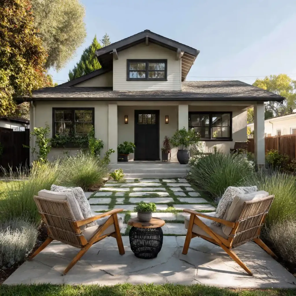 Creating a small seating area in the front yard adds both functionality and warmth. A pair of stylish chairs with a small table can transform unused space into a welcoming corner. Weather-resistant materials ensure durability throughout the seasons. Placing the seating under shade or near greenery enhances comfort. This thoughtful feature makes your exterior feel more personal and inviting.