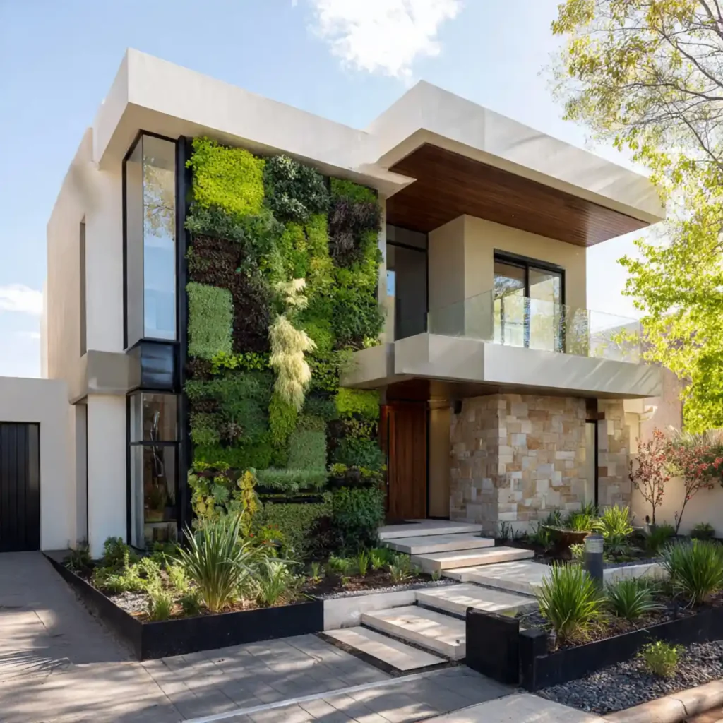 A vertical garden near the entrance introduces a modern and space-saving landscaping solution. Installing mounted planters or green wall panels adds texture and visual interest. Low-maintenance plants such as ferns or succulents make upkeep easier. This feature works particularly well in smaller front yards. A vertical garden instantly makes your home stand out with contemporary charm.