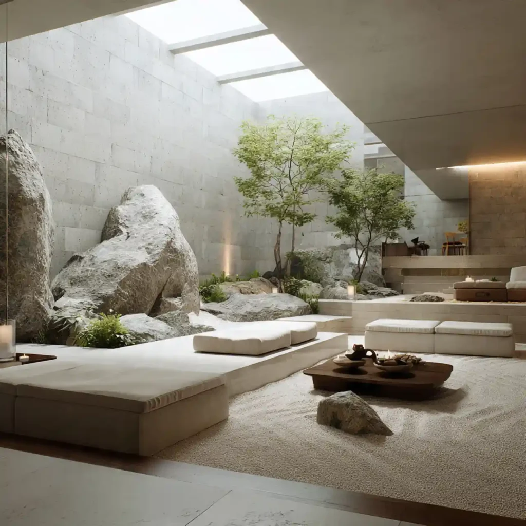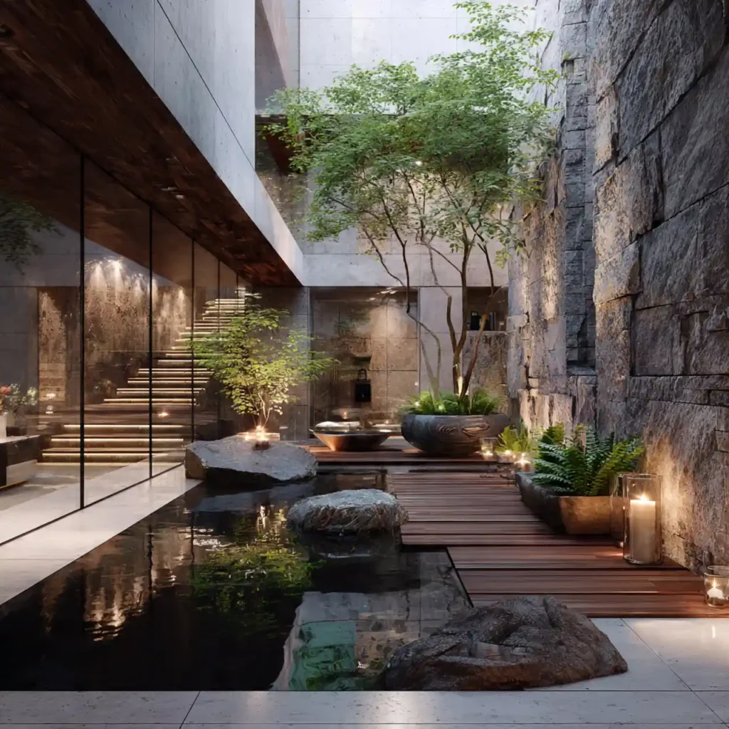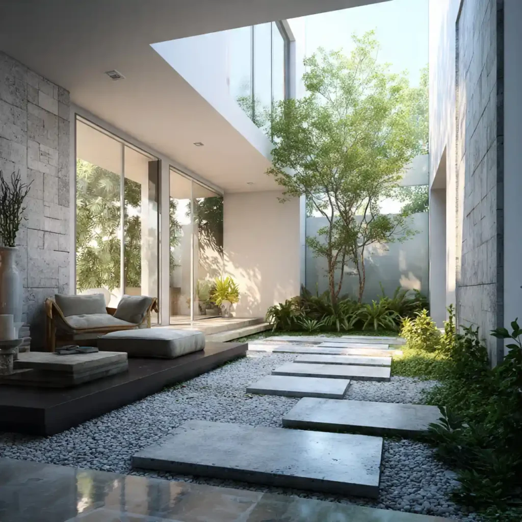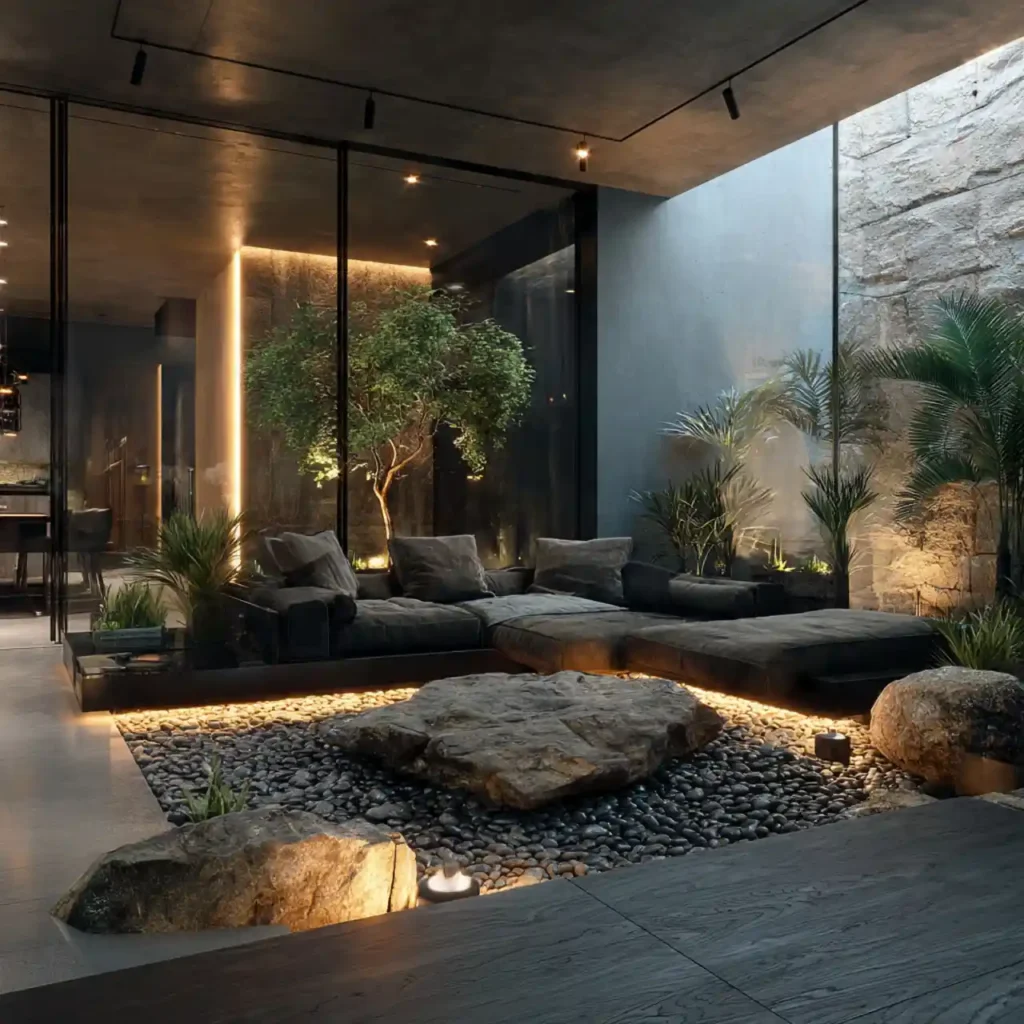 A stone-based courtyard adds texture and contrast. Pebbles and rocks create a natural landscape feel. Neutral tones keep the design refined. Soft lighting enhances shadows and depth. This layout feels grounded and luxurious.