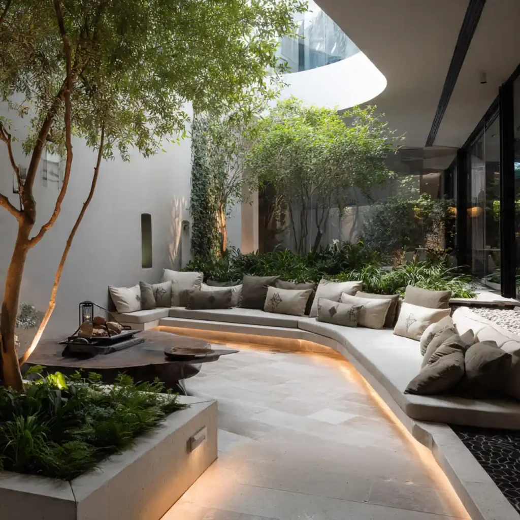 Built-in seating around the courtyard maximizes space. It creates a cozy gathering area. Neutral cushions add comfort and softness. Clean lines maintain a modern look. This design feels functional and elegant.