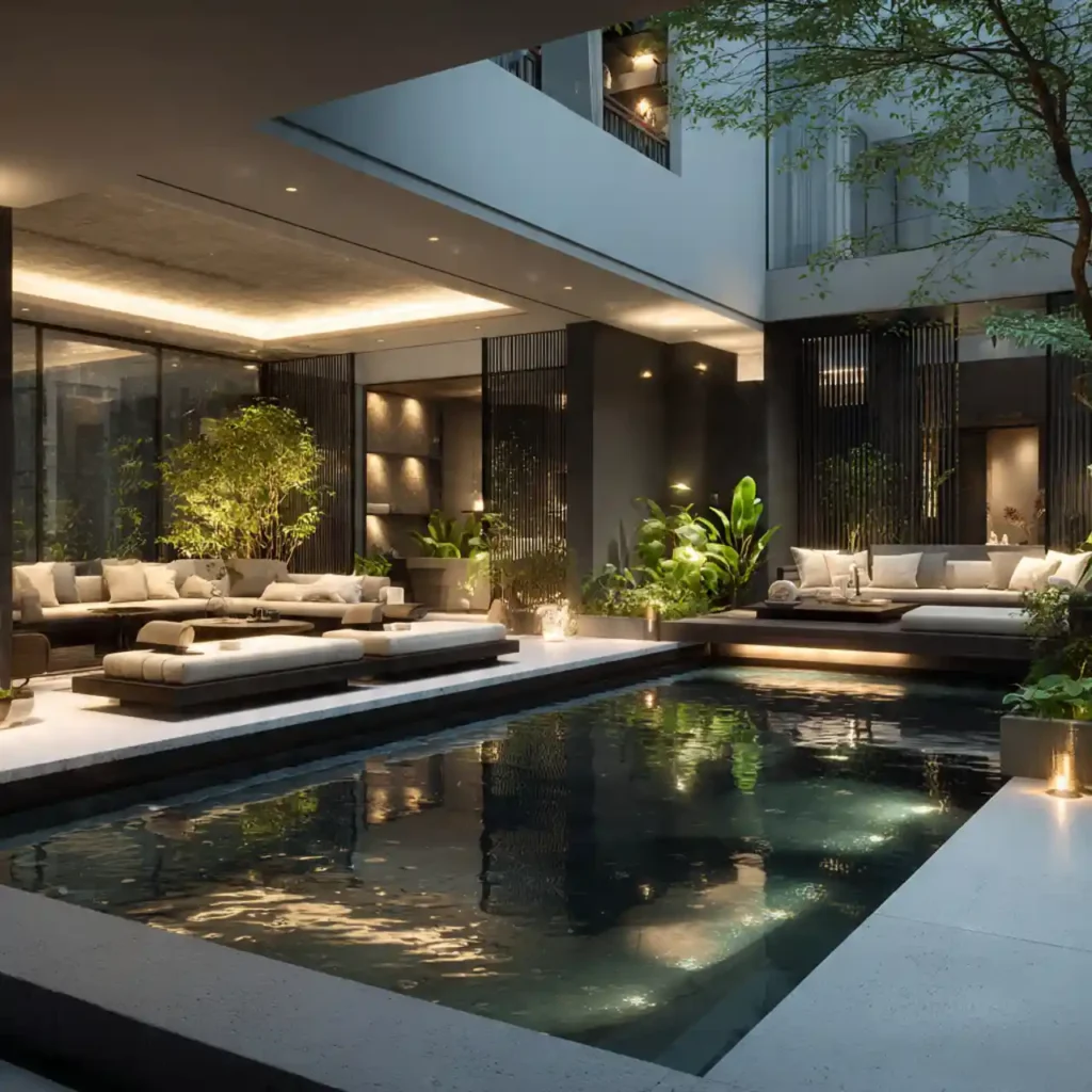 Even a small courtyard can feel spacious with smart design. Minimal plants and clean layouts prevent clutter. Light colors enhance openness. Glass walls maintain visual flow. This idea proves luxury works in any space.