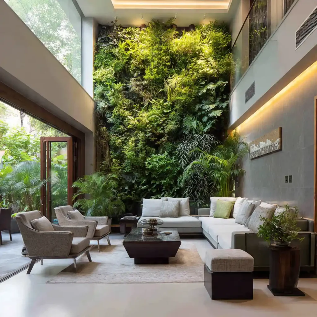 A vertical green wall maximizes greenery without taking space. It adds texture and freshness. Neutral surroundings balance the design. Soft lighting enhances the plants. This layout feels modern and lively.