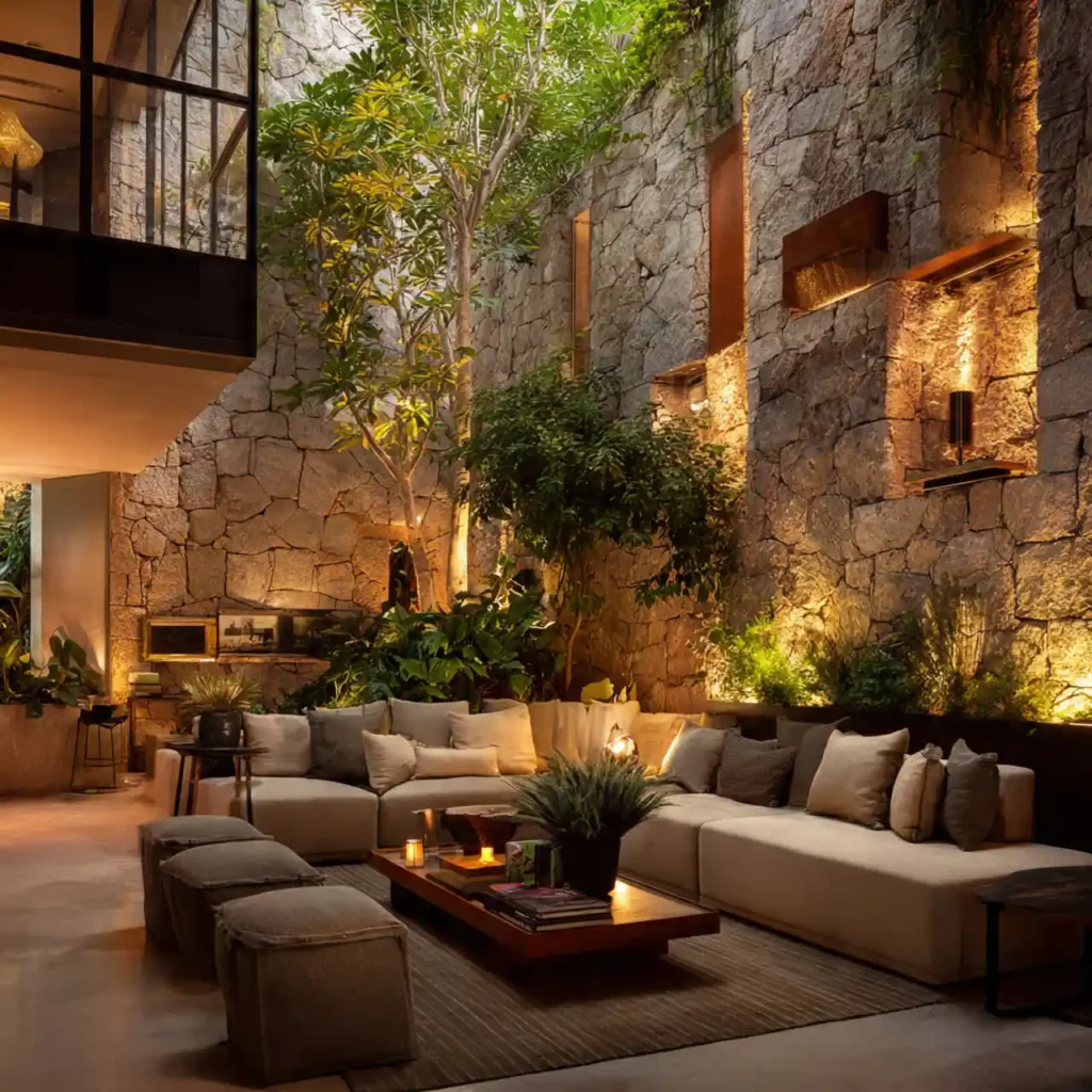 Stone walls add rustic luxury to the courtyard. Their texture enhances visual richness. Warm lighting highlights the details. Minimal furniture keeps it balanced. This design feels earthy and premium.