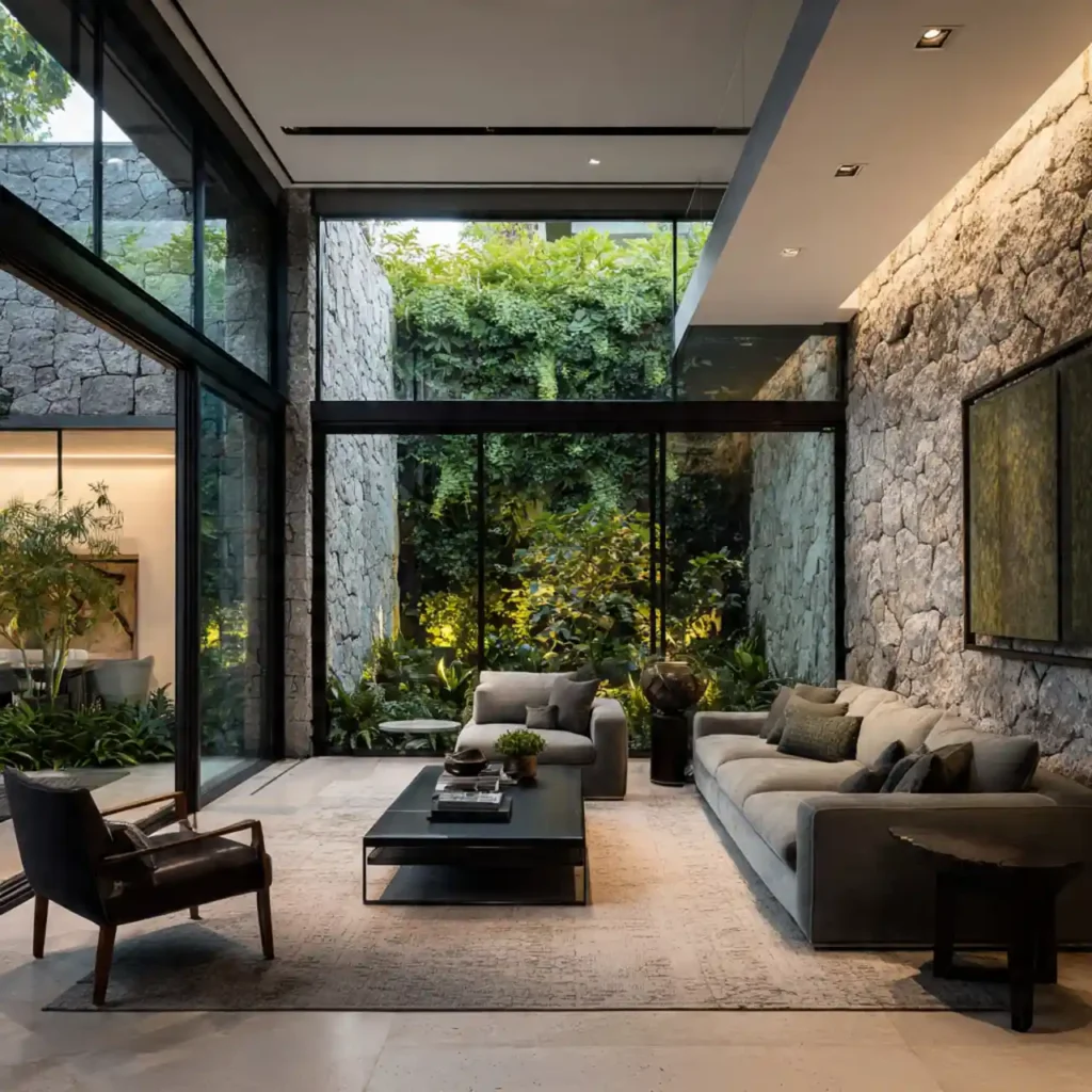 A central indoor garden acts as the heart of the living room. Glass walls keep the view open from every angle. Natural light flows freely across the space. Minimal furniture enhances openness and calmness. This design feels refreshing and luxurious.