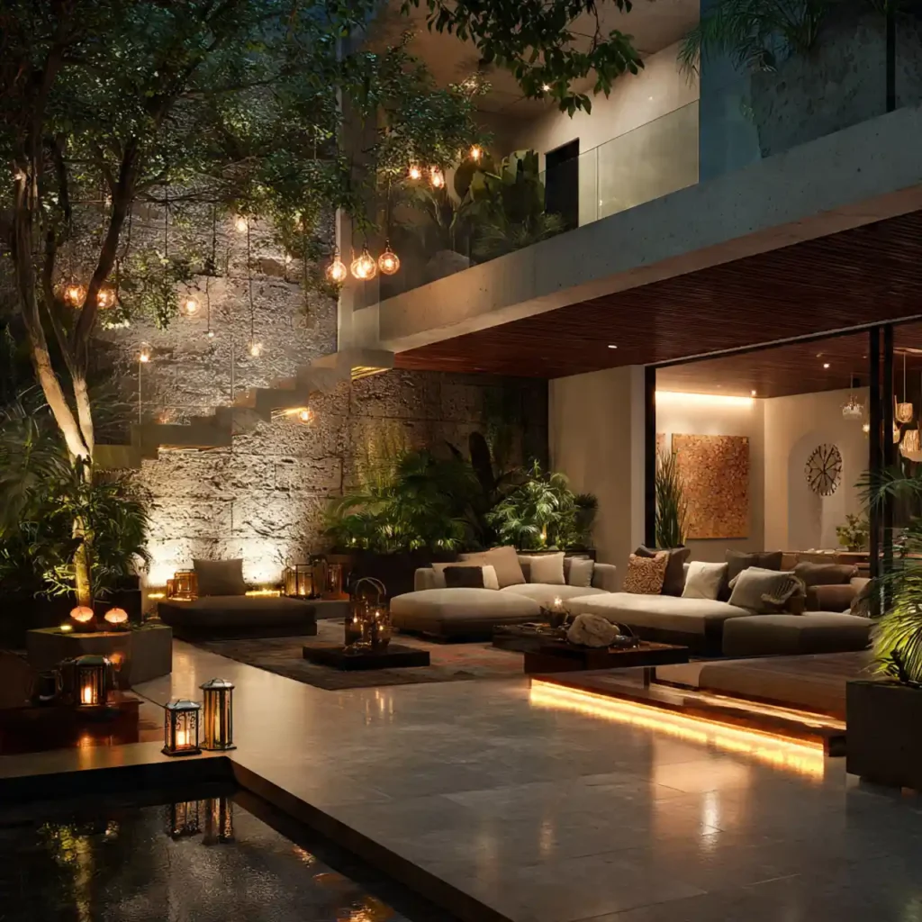 Soft warm lighting transforms the courtyard at night. It creates a cozy and relaxing environment. Shadows add depth and texture. Plants look more dramatic under light. This setup feels luxurious and intimate.