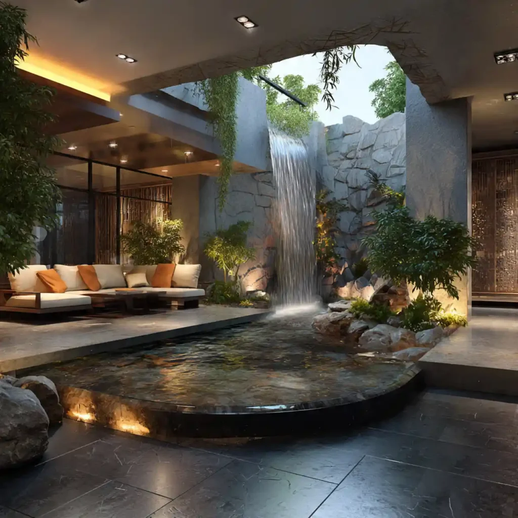 A small indoor fountain or water feature creates a soothing atmosphere. The gentle sound of water enhances relaxation. Natural stone textures add depth to the design. Plants around the feature complete the look. This layout feels like a spa-inspired retreat.