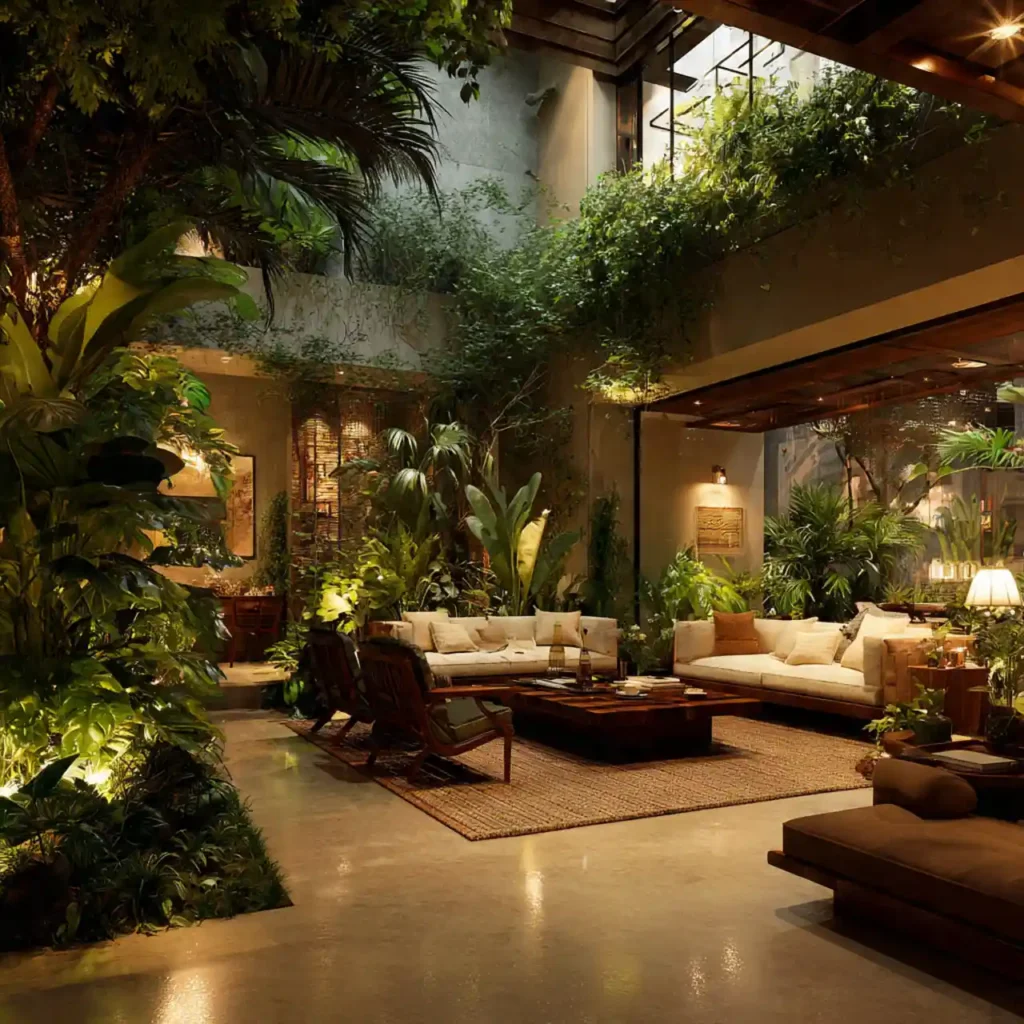 Lush tropical plants create a vibrant and exotic feel. Large leaves add visual depth and texture. Natural wood furniture enhances the organic look. Soft lighting balances the greenery. This setup feels like a private island resort.