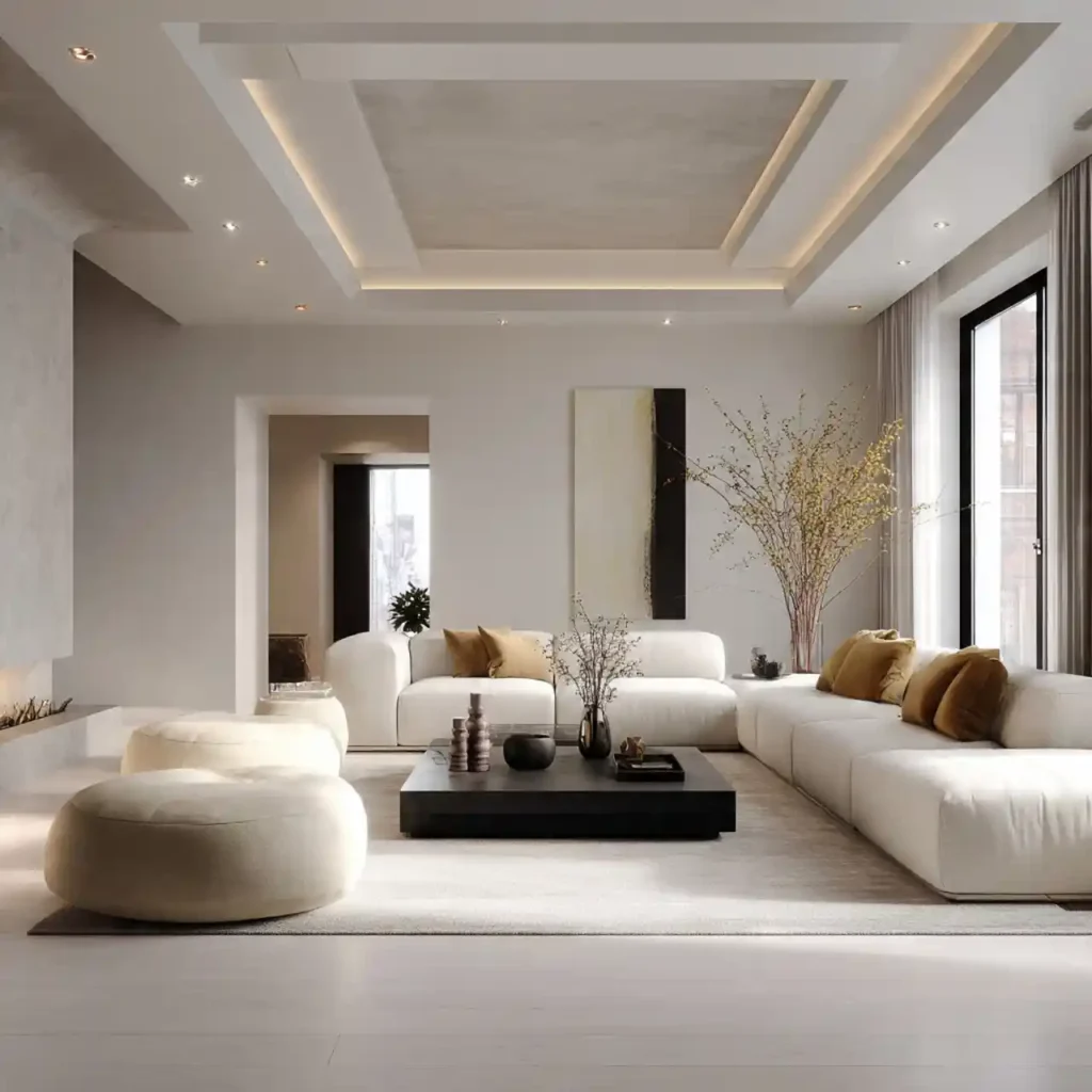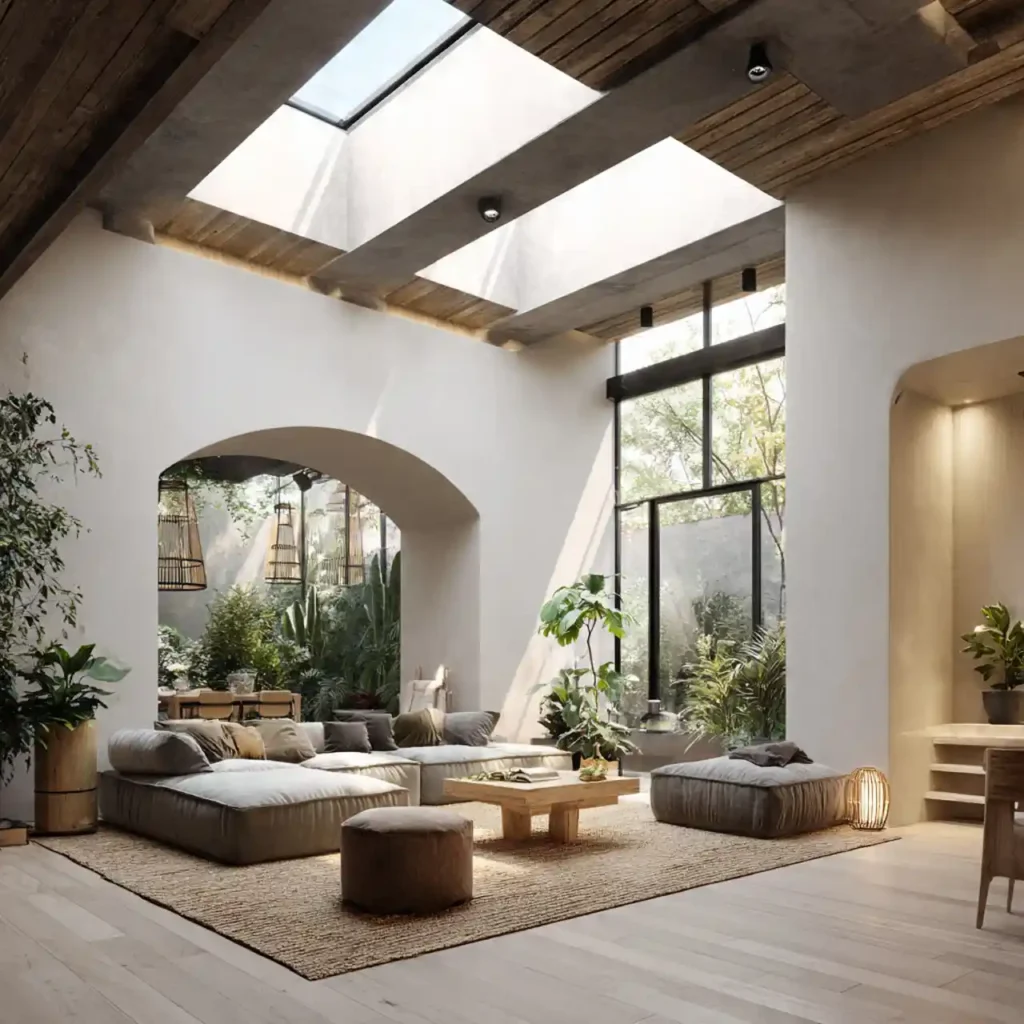 Multiple skylights allow controlled natural light into the space. The lighting changes beautifully throughout the day. Plants and textures appear more dynamic. Minimal décor keeps the focus on light. This layout feels modern and airy.