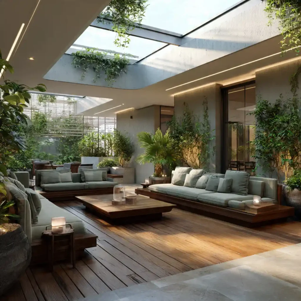 A wooden deck inside the courtyard adds warmth and comfort. Natural textures enhance the organic feel. Soft seating around the deck creates a cozy area. Light tones maintain openness. This design feels welcoming and premium.