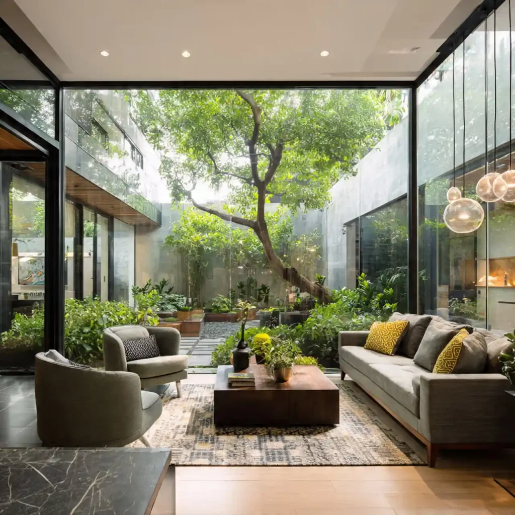 Full glass partitions separate the courtyard from the living area. It keeps the visual flow uninterrupted. Light travels freely across both spaces. Minimal frames enhance modern aesthetics. This idea feels clean and luxurious.