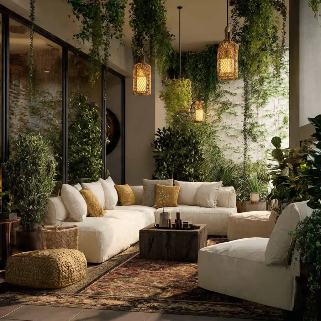 Hanging greenery adds vertical interest and depth. It creates a layered natural environment. Soft lighting highlights the plants beautifully. Minimal furniture keeps the focus balanced. This design feels lush yet airy.