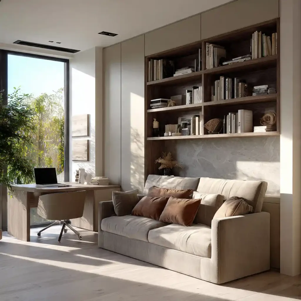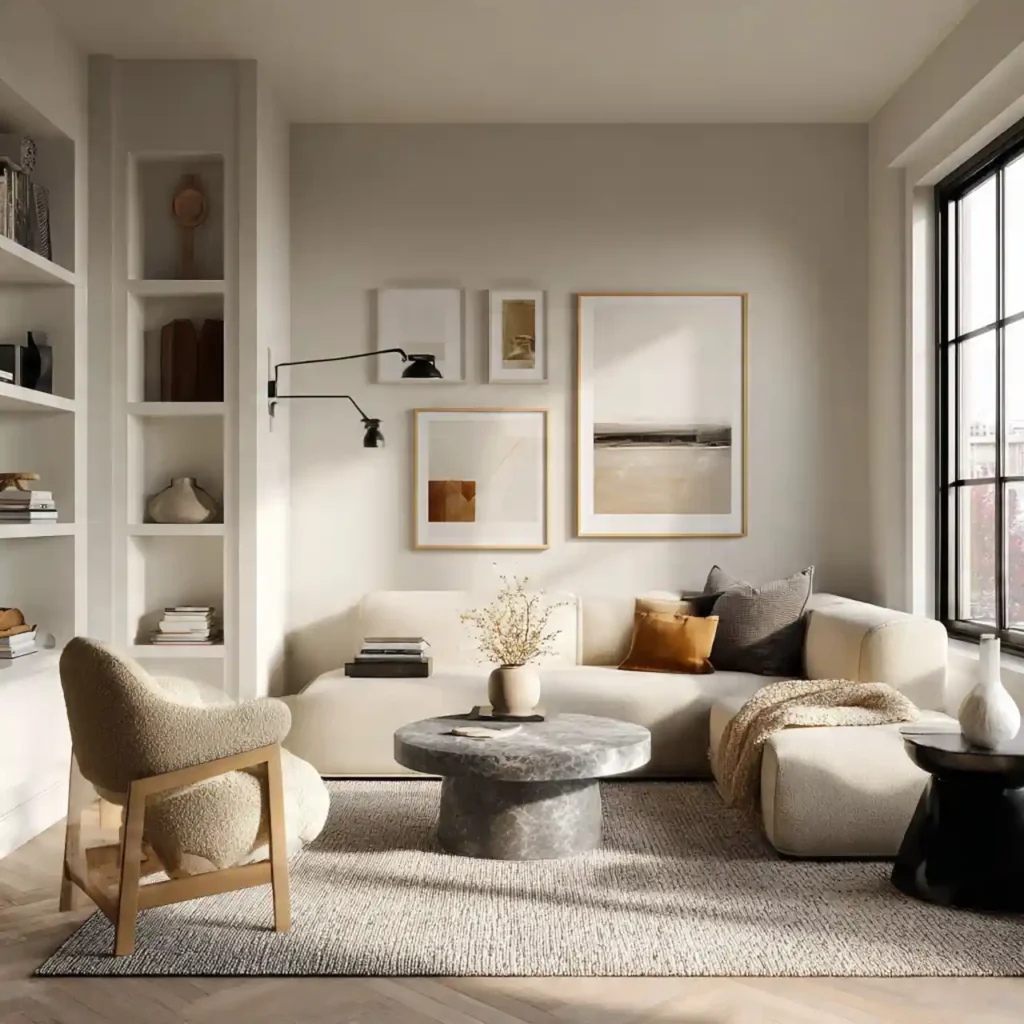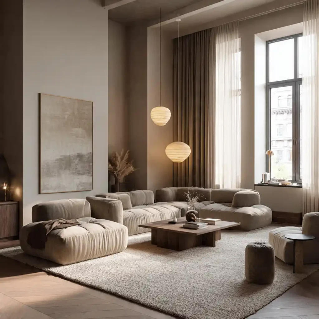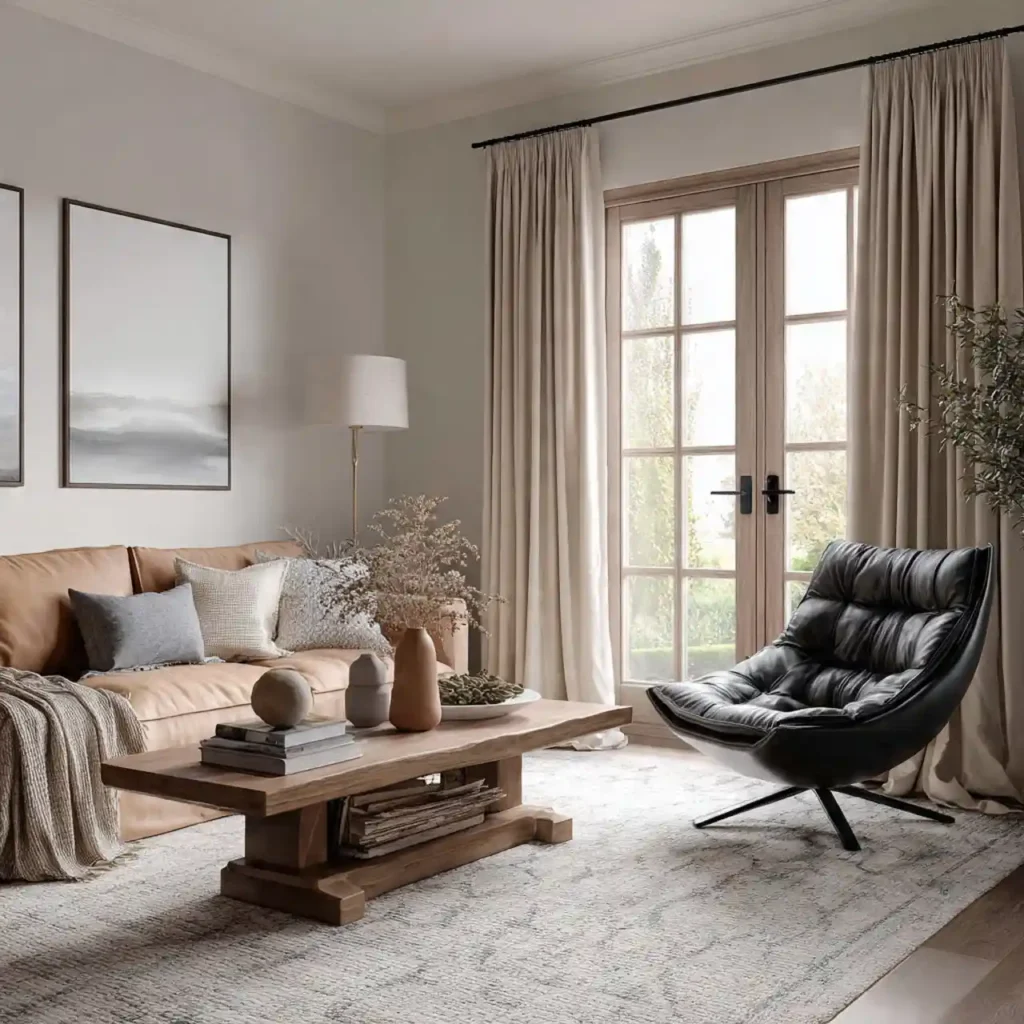 Warm minimalism replaces cold, sterile white spaces with soft beige, cream, taupe, and warm gray tones. Instead of empty rooms, this trend embraces subtle layers of texture and comfort. Linen curtains, plush rugs, and natural wood furniture create warmth without clutter. The focus remains simple, but never lifeless. This approach makes interiors feel calm, welcoming, and effortlessly elegant.