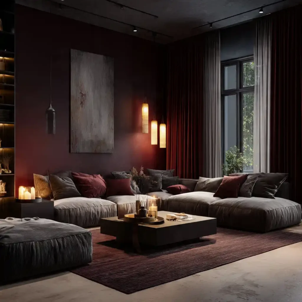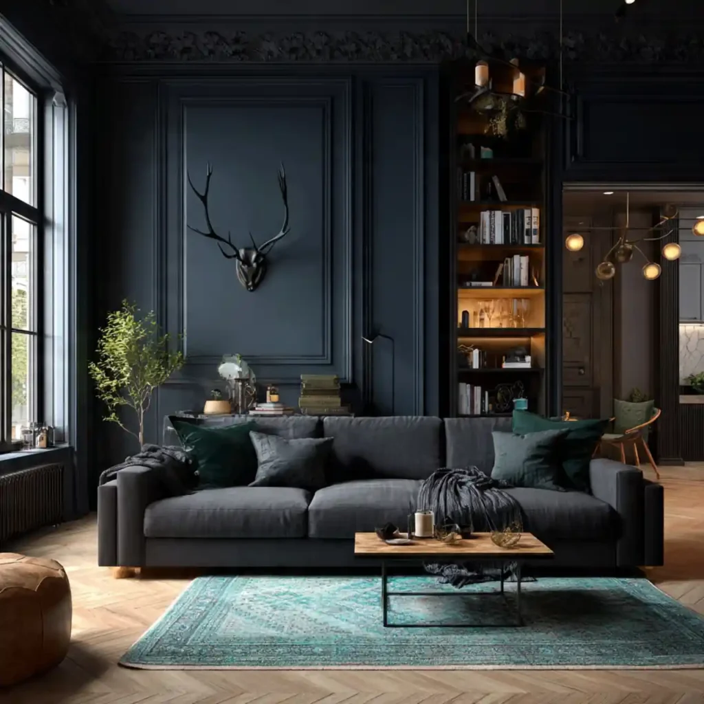 While open spaces dominate, cozy darker rooms are emerging. Deep paint colors create intimacy. Soft lighting enhances mood dramatically. These spaces feel comforting and private. Dark interiors add emotional depth.