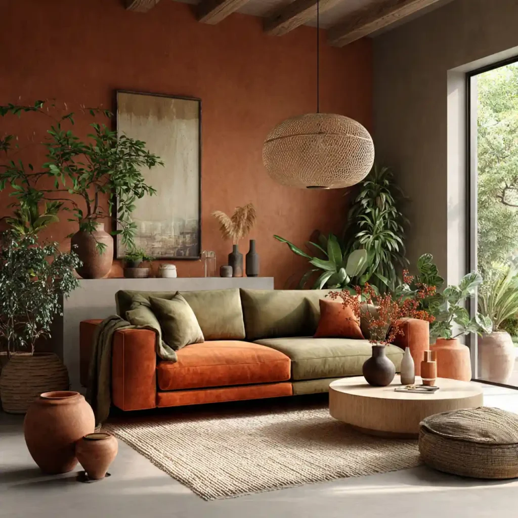 Earth-inspired shades such as terracotta, olive green, clay, caramel, and sand are dominating interiors. These tones connect the home to nature and create emotional comfort. Walls, upholstery, and décor pieces are shifting toward grounded, organic colors. Earth tones add depth without overwhelming the space. This palette feels timeless and stable, perfect for long-term design.