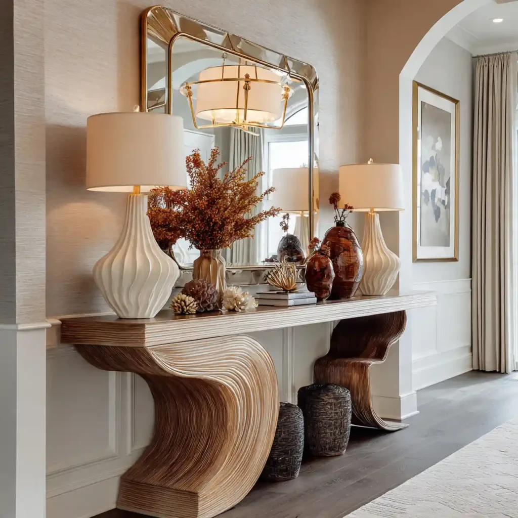 Entryways are becoming more dramatic and styled. Bold mirrors, sculptural consoles, and layered lighting define the space. The entrance sets the mood for the entire home. First impressions matter strongly. A styled foyer enhances overall design cohesion.