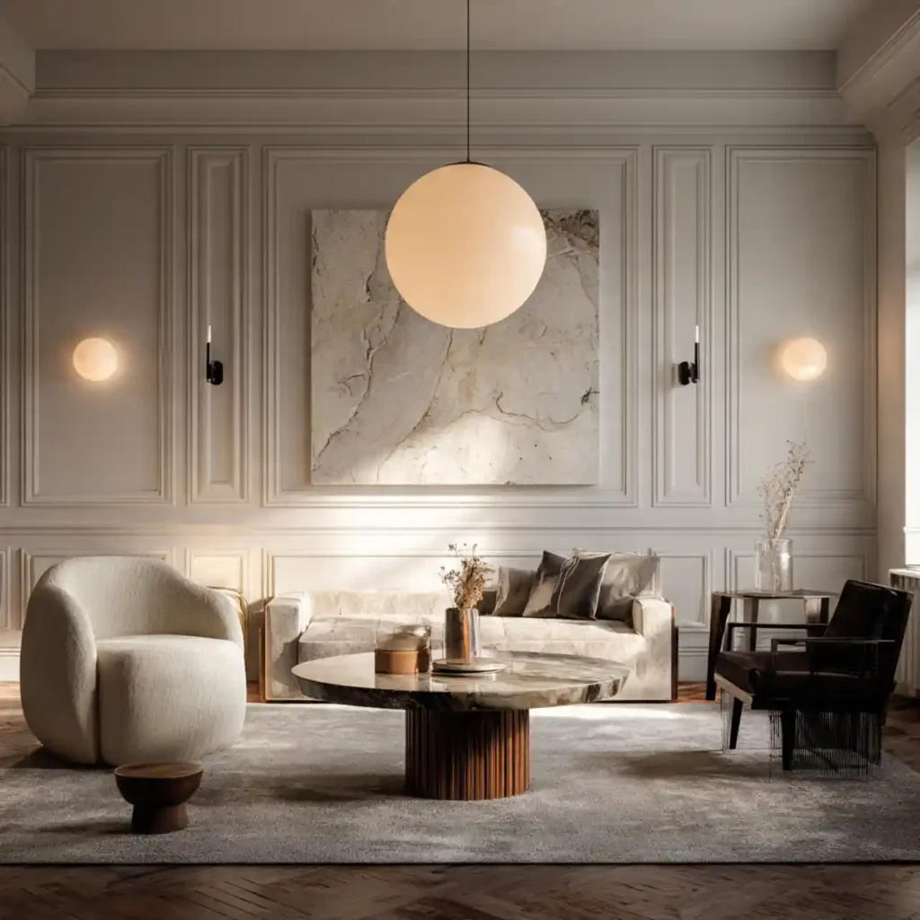 Organic modern combines clean contemporary lines with raw natural materials. Think stone coffee tables, curved sofas, wooden beams, and soft neutral fabrics. It balances structure with softness beautifully. The style feels refined yet relaxed at the same time. In 2026, this will be one of the most desired high-end interior looks.