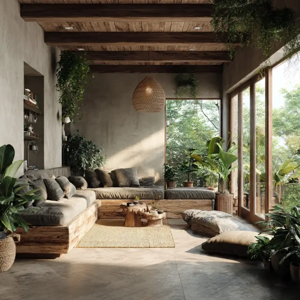 Large windows and sliding glass doors blur the boundary between indoors and outdoors. Natural light becomes a primary design element. Indoor plants enhance this connection. Outdoor views are intentionally framed. This approach improves mental well-being and openness.