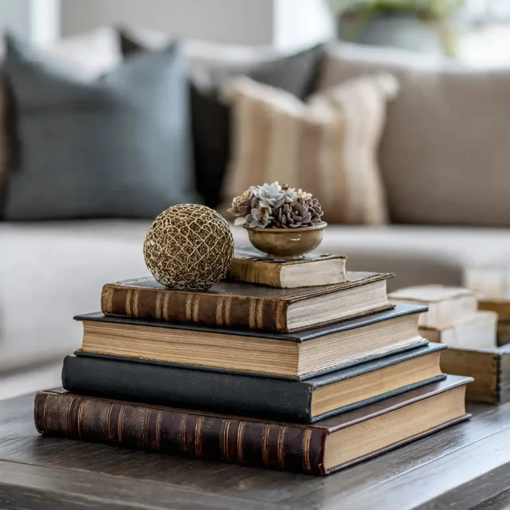 Books add height and personality. Designers stack them horizontally and vertically. They create layered surfaces. Coffee table books add sophistication. They also spark conversation.