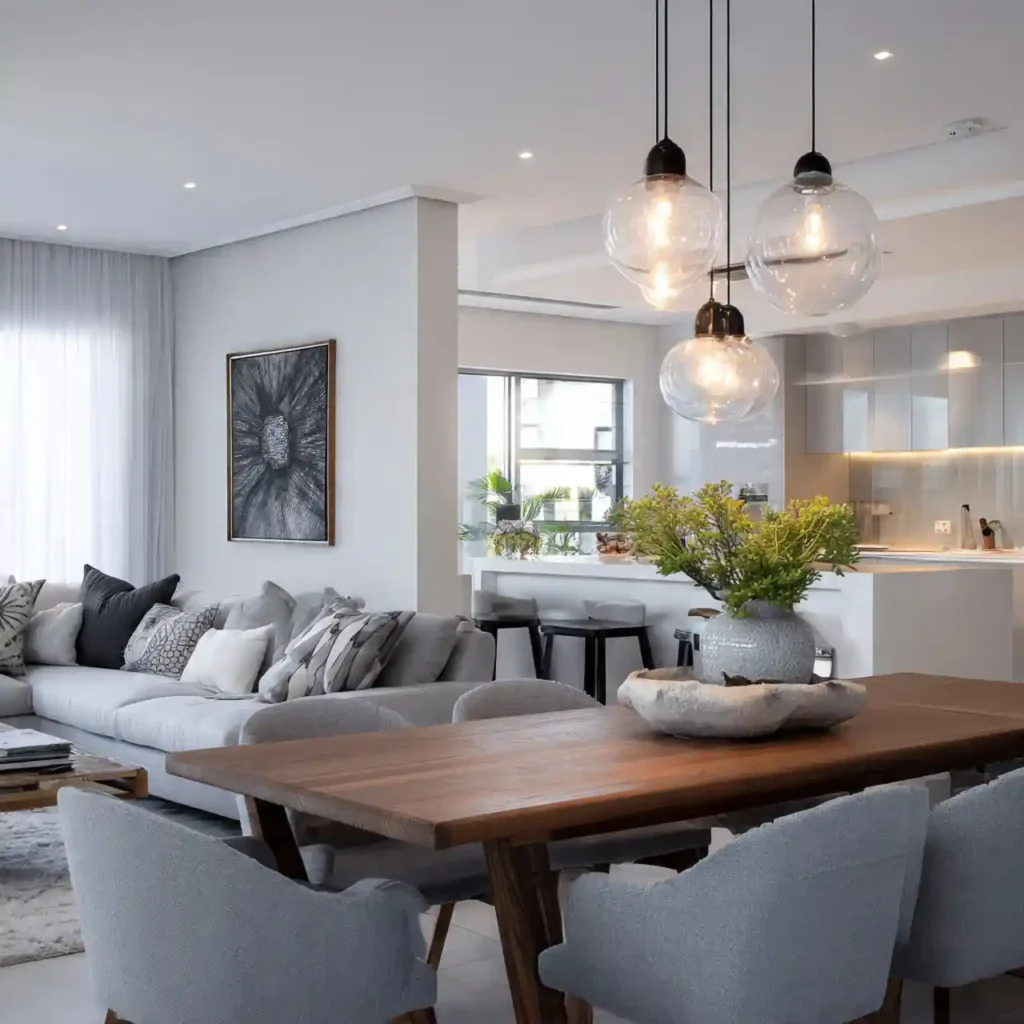 Pendant lights over dining tables create visual zoning. Designers use lighting to separate open-plan areas. It adds architectural clarity. Lighting shapes how a room feels. It enhances flow.