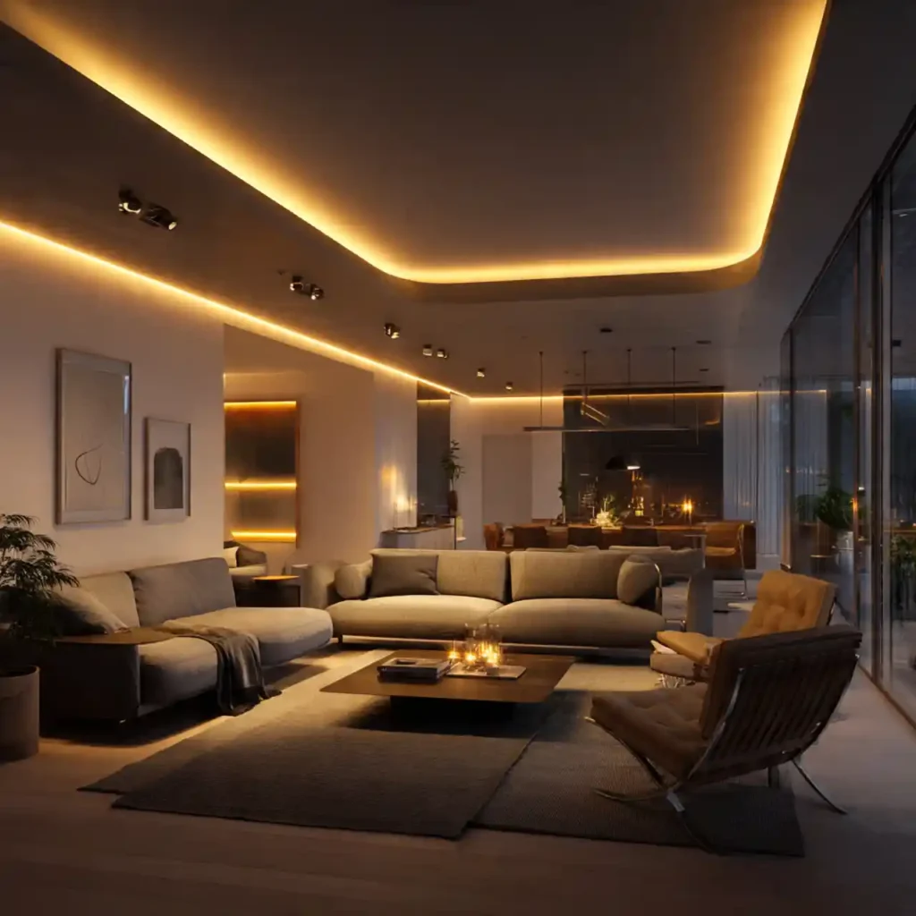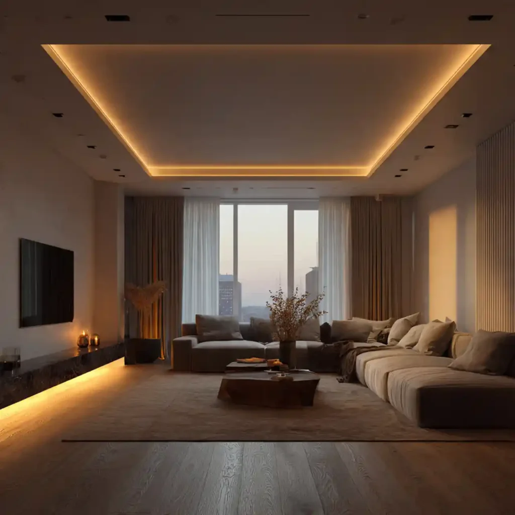 Ceiling perimeter LED strips with warm glow create floating effect. Avoids direct overhead glare. Works well in modern minimalist spaces. Complements soft floor lamps and pendant lighting. Adds subtle luxury vibe.