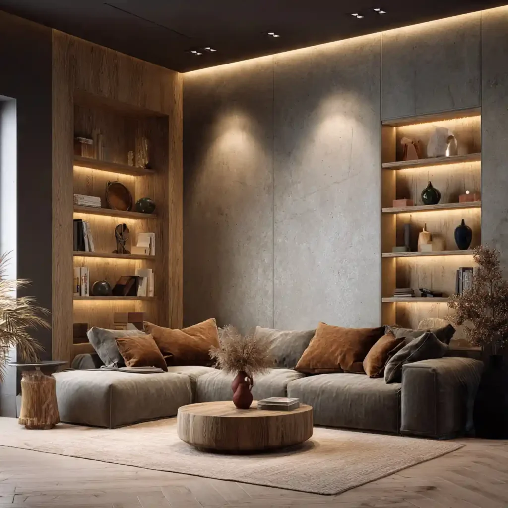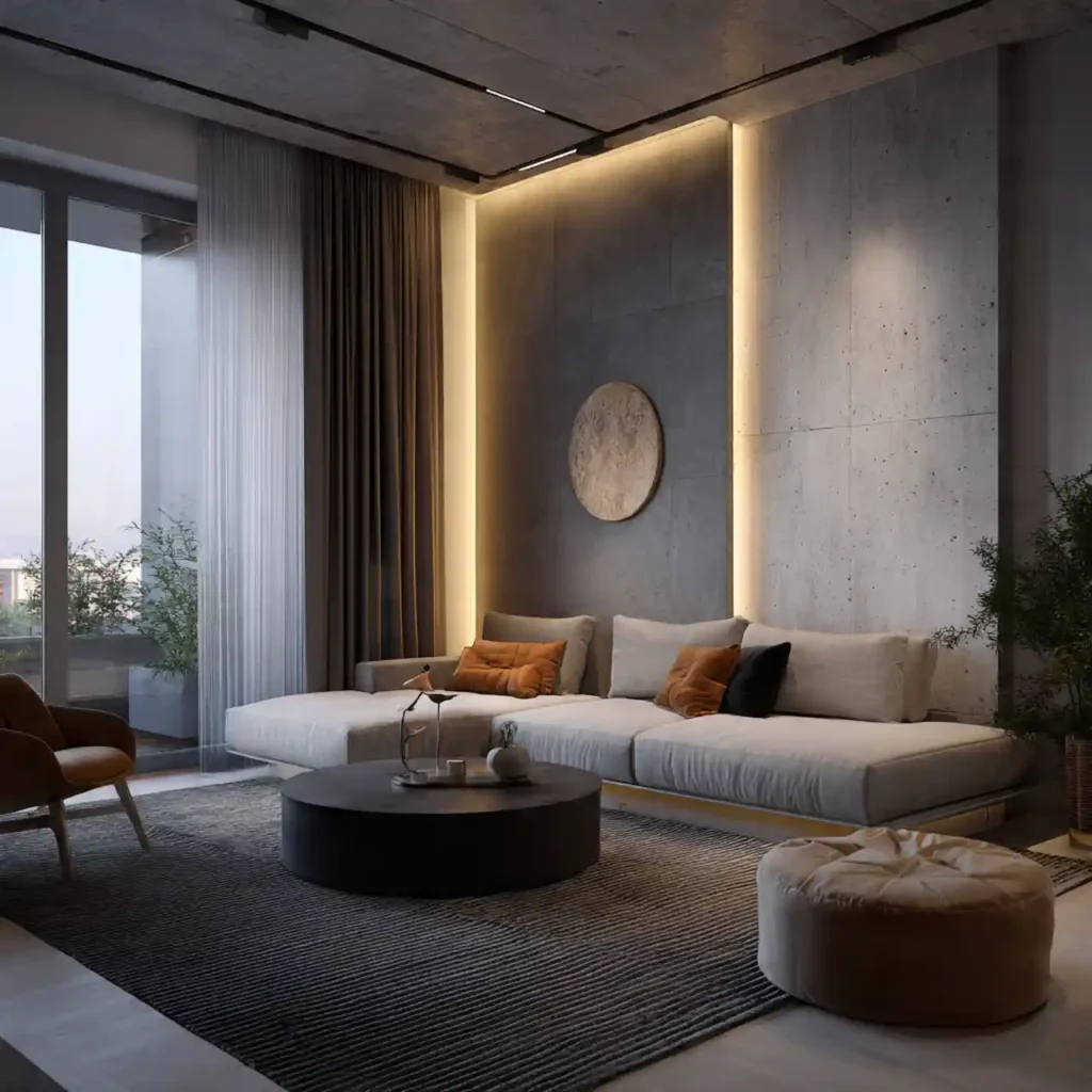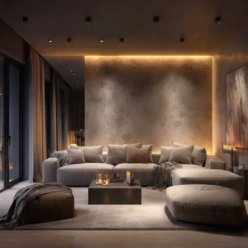Floor cove lighting near furniture edges gives soft upward glow. Enhances textures and shadows without direct glare. Perfect for night mood lighting. Complements layered ceiling or table lamps. Adds cinematic and cozy effect.