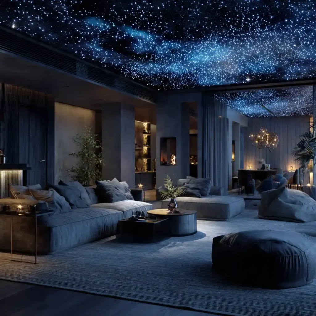 Tiny fiber optic lights embedded in ceiling for soft twinkle effect. Mimics starlight for relaxing evenings. Works beautifully in media or lounge areas. Pairs with dimmable LEDs for layered glow. Unique and immersive soft lighting idea.