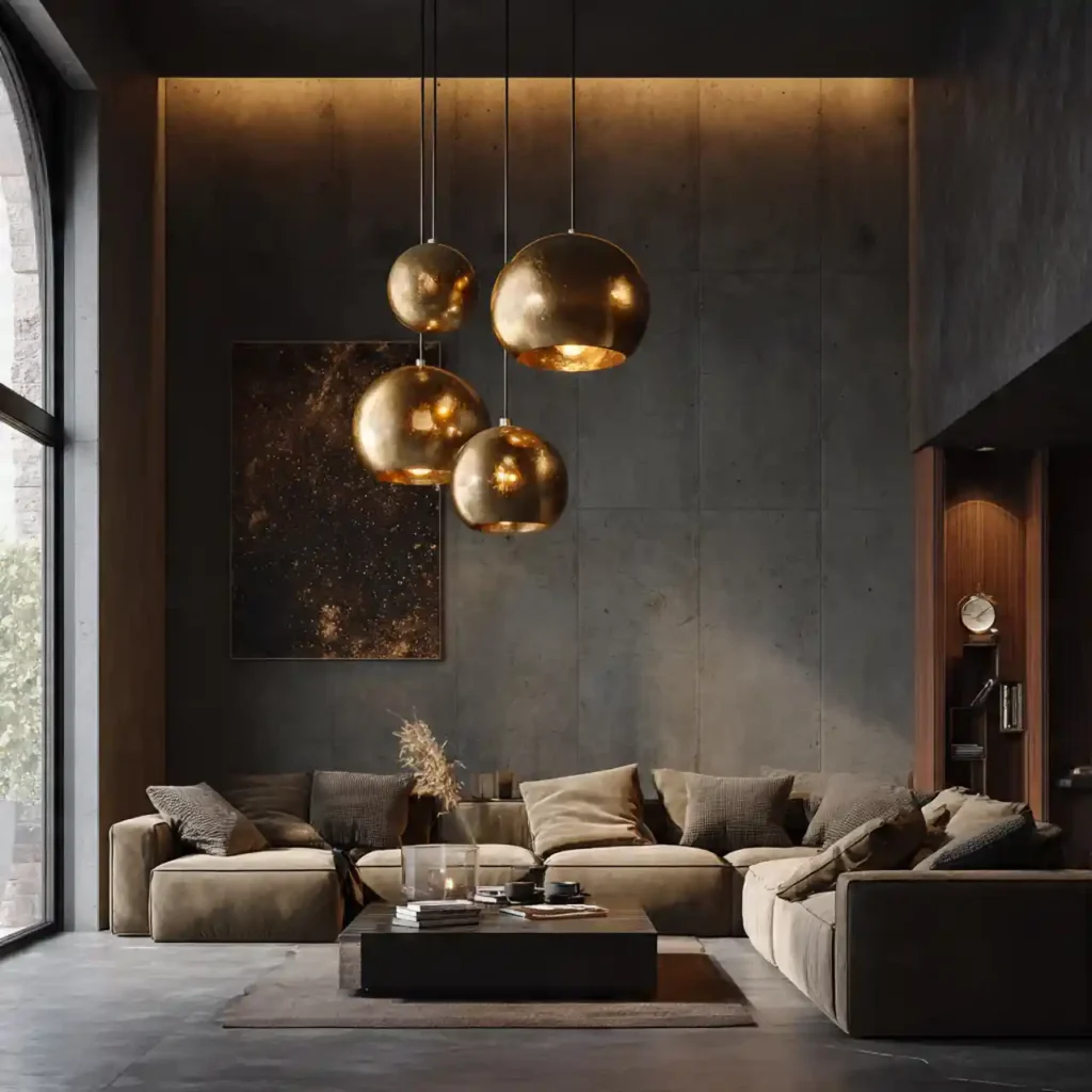 A group of warm-toned pendant lights hanging over the seating area adds intimacy. Varying lengths create visual rhythm. The soft light diffuses through frosted or fabric shades. Ideal for dining-living combos. It turns the space into a welcoming haven.