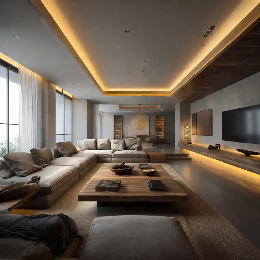 Low-level cove lighting near the floor adds subtle drama. Guides movement without brightening the entire space. Works well behind sofas or along walls. Creates a hotel-lobby luxury vibe. Perfect for cinematic evenings at home.