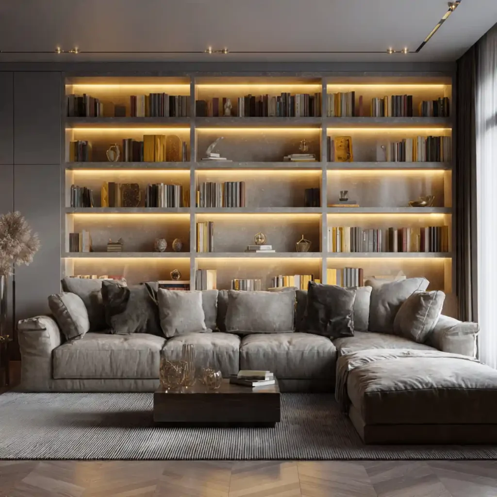 Shelving units with integrated backlighting highlight décor softly. Warm LEDs behind books or ornaments add depth. The glow avoids direct brightness, keeping the room cozy. Works with wood or glass shelving. Elevates both ambiance and aesthetics.