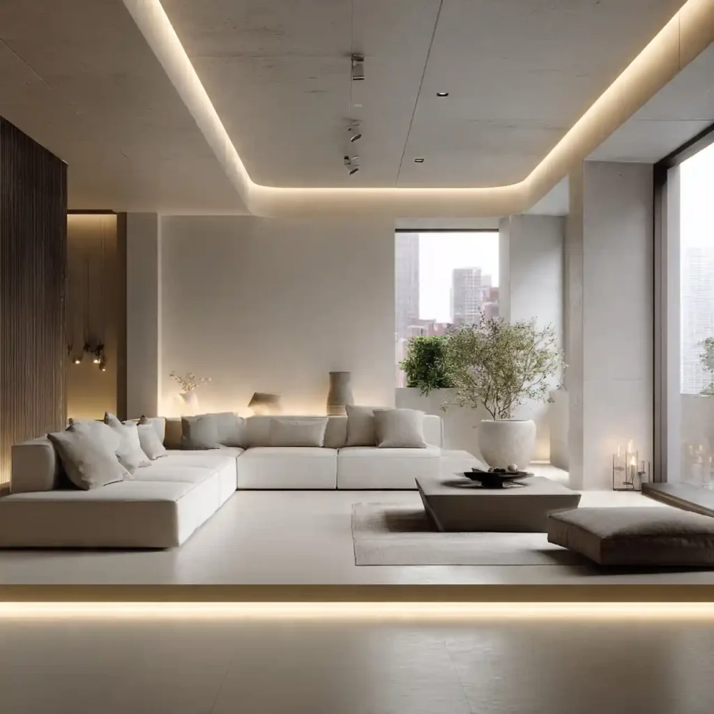 Subtle recessed LED lighting across ceilings and coves creates an even, calming glow. It highlights architectural features without overwhelming the room. Layering with dimmable lights allows for control over mood. Neutral-toned walls reflect the light softly. Perfect for modern minimalist interiors.