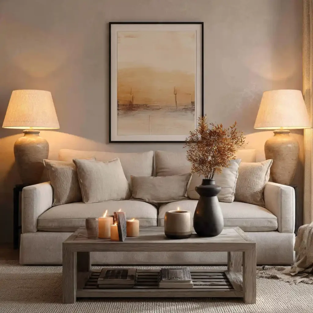 Classic table lamps with linen shades diffuse soft, warm light. Placing one on side tables balances the room lighting. It creates cozy pockets of illumination. Ideal for reading or relaxing. Adds layered lighting without overpowering the décor.