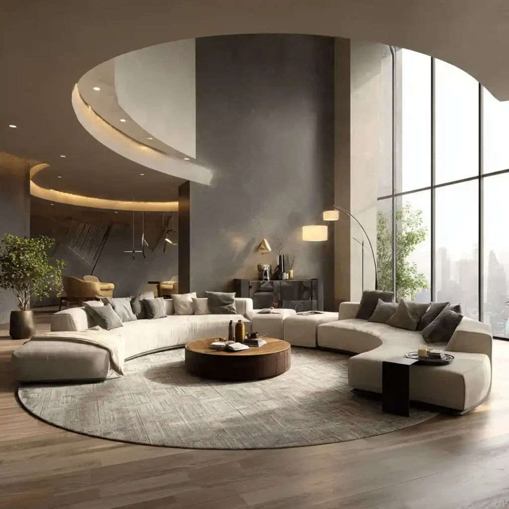 Arrange sofas and chairs in a circle around a central coffee table. Curved furniture enhances flow and intimacy. This layout encourages conversation. Round rugs and soft lighting complement the space. Circular arrangements feel chic, inviting, and expansive.