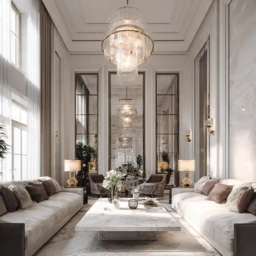 Place identical sofas or chairs facing each other with a central coffee table. Symmetry creates balance and visual order. Add a chandelier in the center to anchor the design. Mirrors on the walls reflect light and enhance spaciousness. Symmetrical layouts feel classic and high-end.