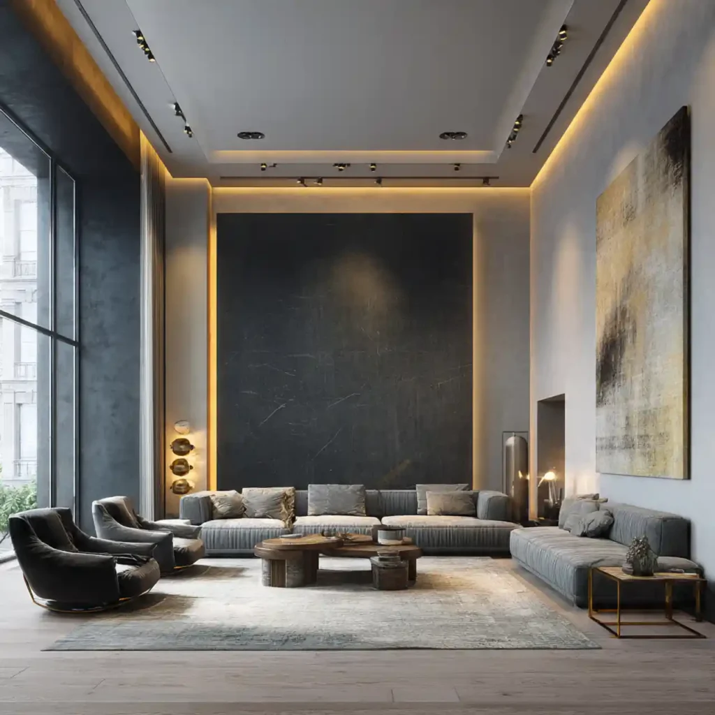 Use one bold accent wall to anchor furniture without crowding the room. Keep other walls minimal and light-colored. Position sofa and chairs along the wall. Statement artwork or panels add luxury. Accent walls create focus while maintaining openness.