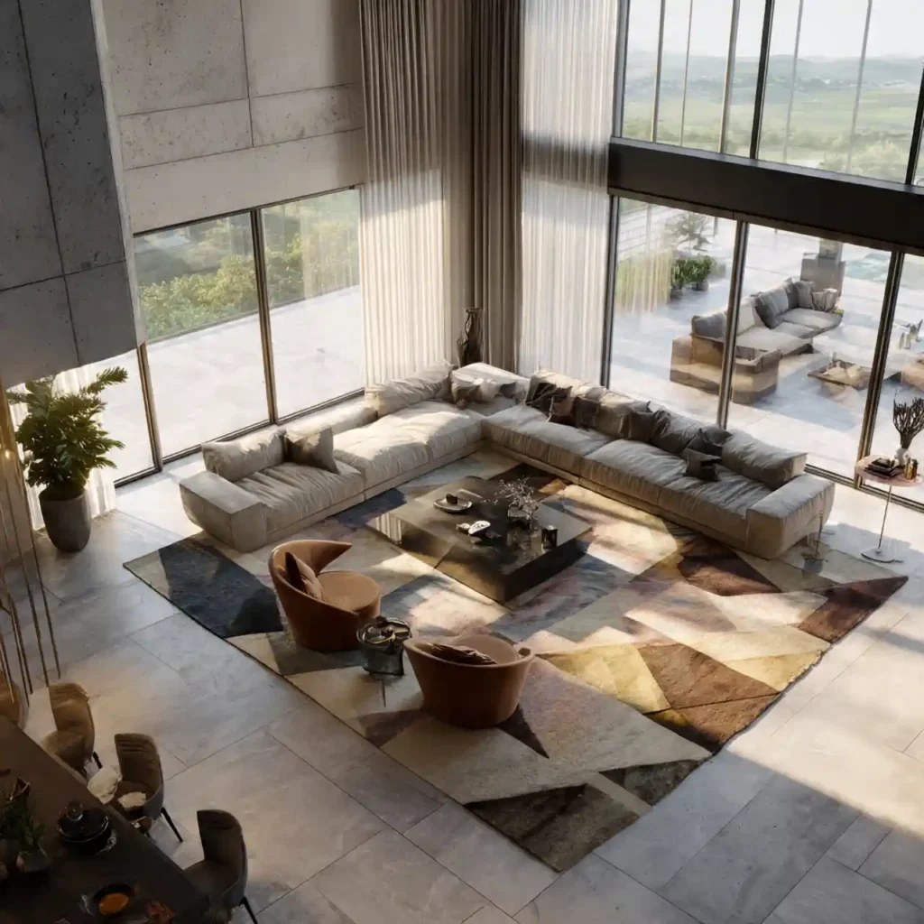Anchor all seating around a large, high-quality rug. Rugs unify the furniture visually and maintain spacious flow. Use minimal furniture to avoid overcrowding. Add side tables and floor lamps for balance. This layout emphasizes luxury and openness.