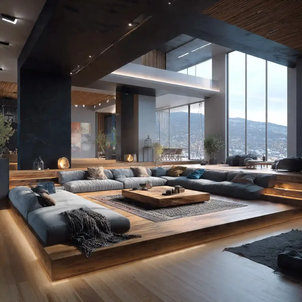 Introduce subtle level changes with a raised platform for the seating area. Steps or contrasting flooring create depth. This adds visual interest without closing off space. Combine with low furniture to maintain openness. Multi-level designs feel dynamic and luxurious.