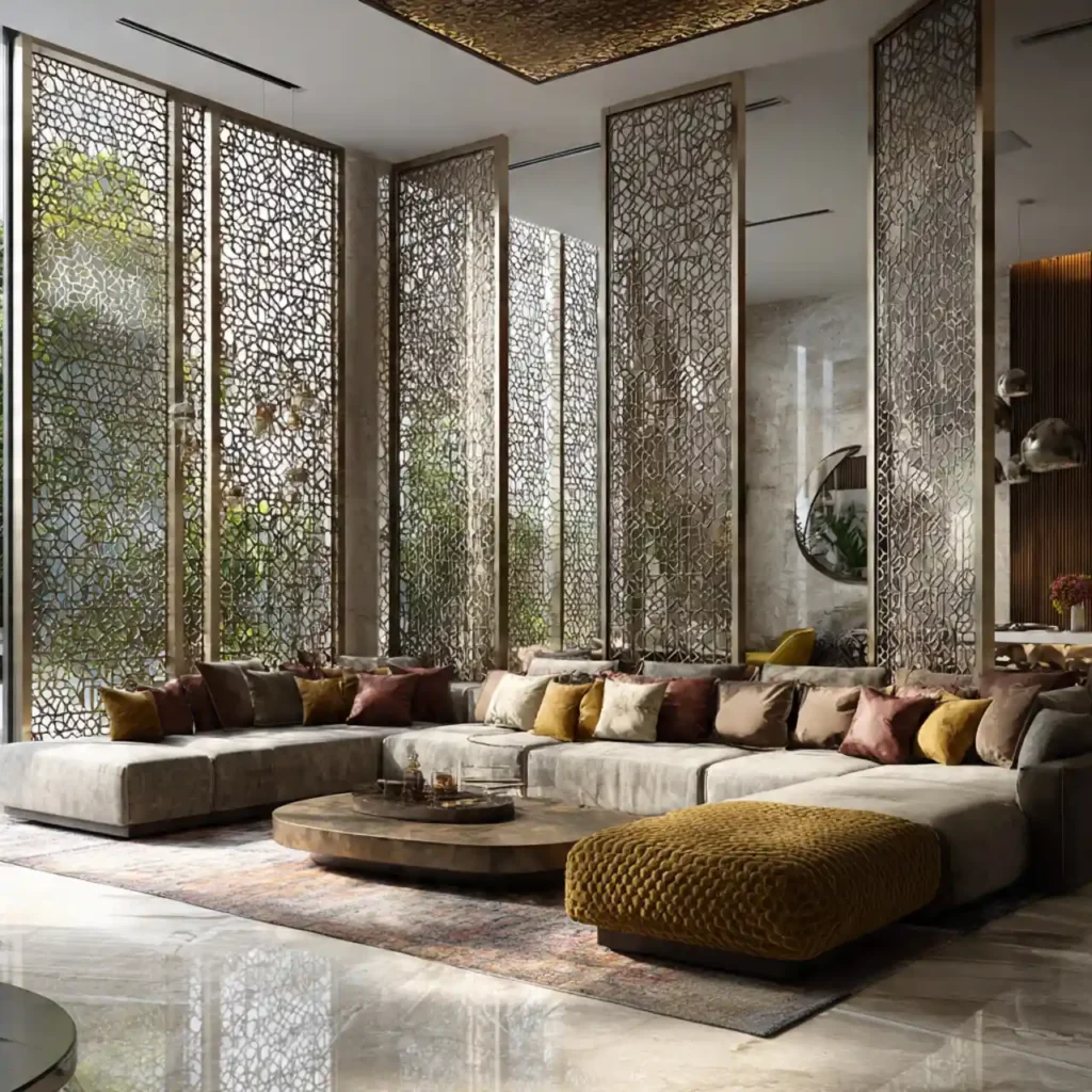 Use decorative open lattice or metal partitions to separate seating zones without blocking light. They create a subtle division while maintaining flow. Add low furniture to keep sightlines open. This layout balances privacy and spaciousness.
