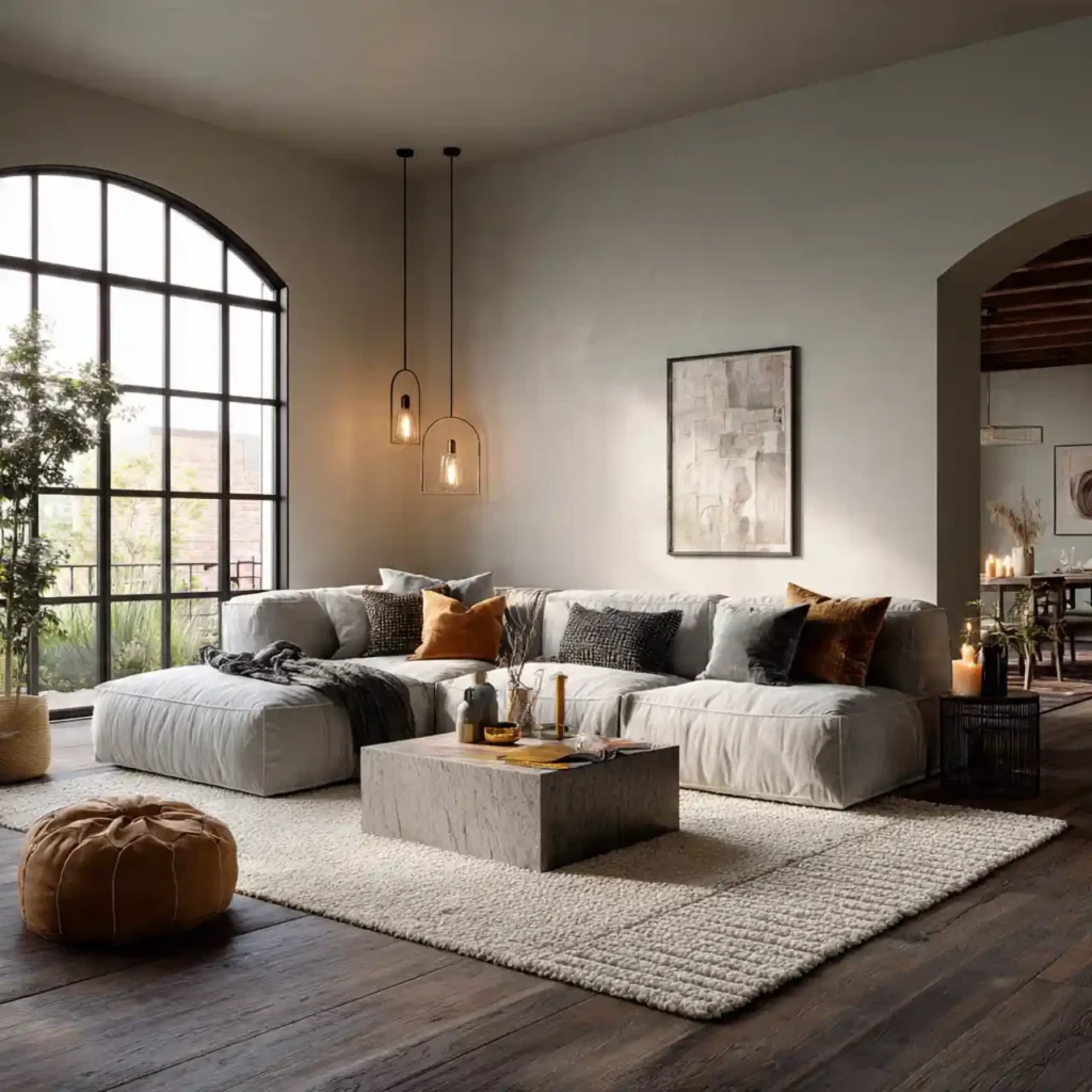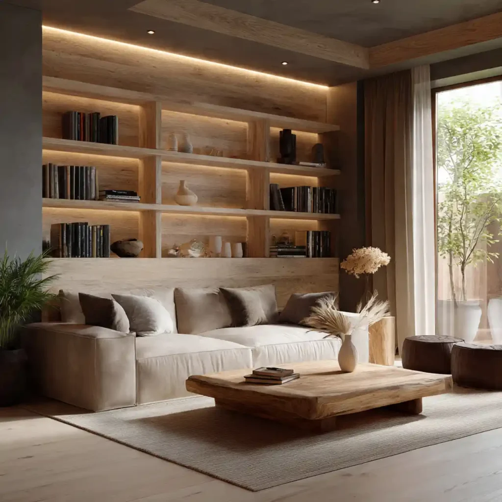 Wood introduces warmth and authenticity. Whether through a coffee table, beams, or shelving, natural materials ground the space. Wood tones contrast beautifully with soft textiles. The room feels balanced and inviting. Nature-inspired elements enhance emotional comfort.