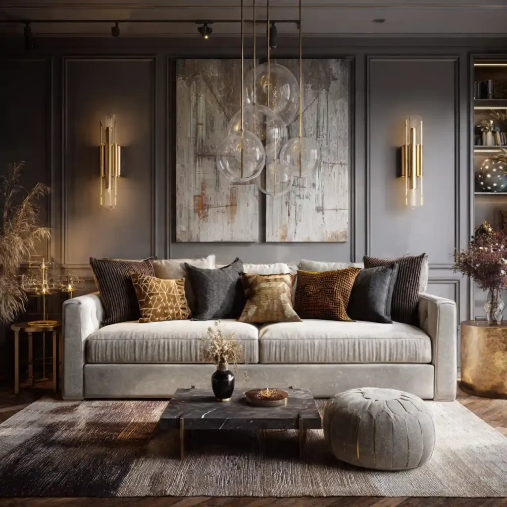 Brushed brass or matte black accents add understated sophistication. Lamps, trays, or hardware introduce shine without overpowering. Metallic touches reflect light softly. The result feels elevated yet balanced. Glamour works best in moderation.