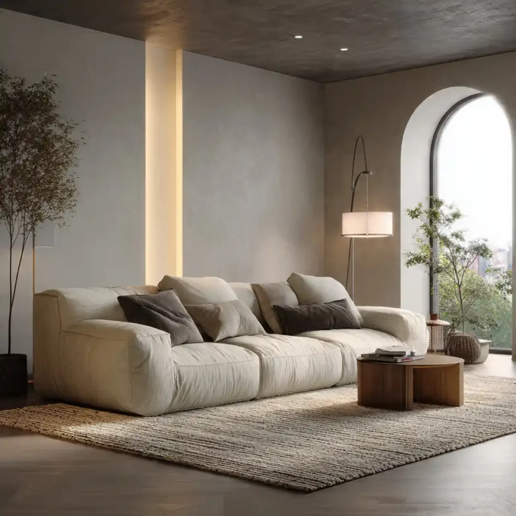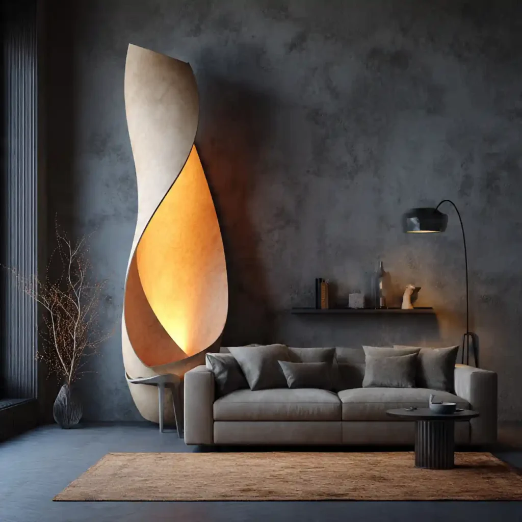 A sculptural floor lamp acts as both lighting and art. Soft diffused light creates a glow that gently fills empty corners. It introduces height variation in the room composition. Warm ambient lighting reduces visual stress in the evening. A single dramatic lamp can completely shift the mood.