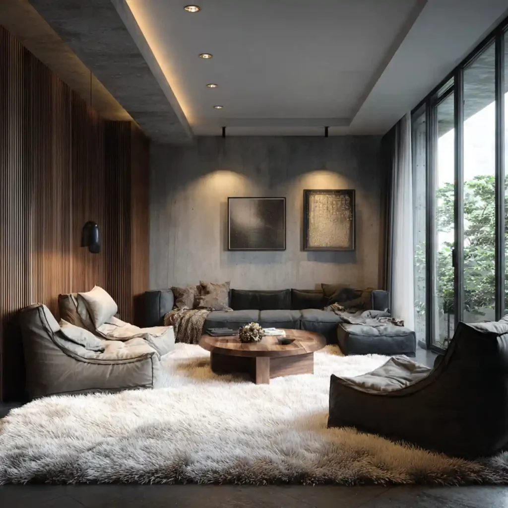 A large rug grounds the entire seating area and absorbs echo. It visually connects furniture pieces into one cohesive zone. Soft textures underfoot increase comfort levels. The right rug adds warmth without overpowering the design. Atmosphere improves when the room feels unified.