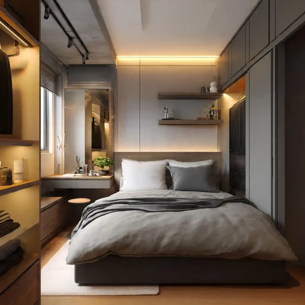 The bedroom doubles as a guest room and home office. A foldable desk saves space when not needed. Neutral décor keeps the room welcoming. The bed remains comfortable and inviting. This design adapts easily to changing needs.
