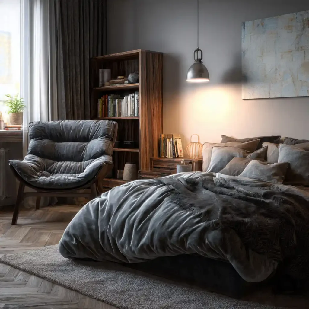 A cozy chair and lamp create a reading zone. Bookshelves provide organized storage. The bed area stays calm and peaceful. Soft textiles add warmth to the room. This bedroom supports relaxation and learning.