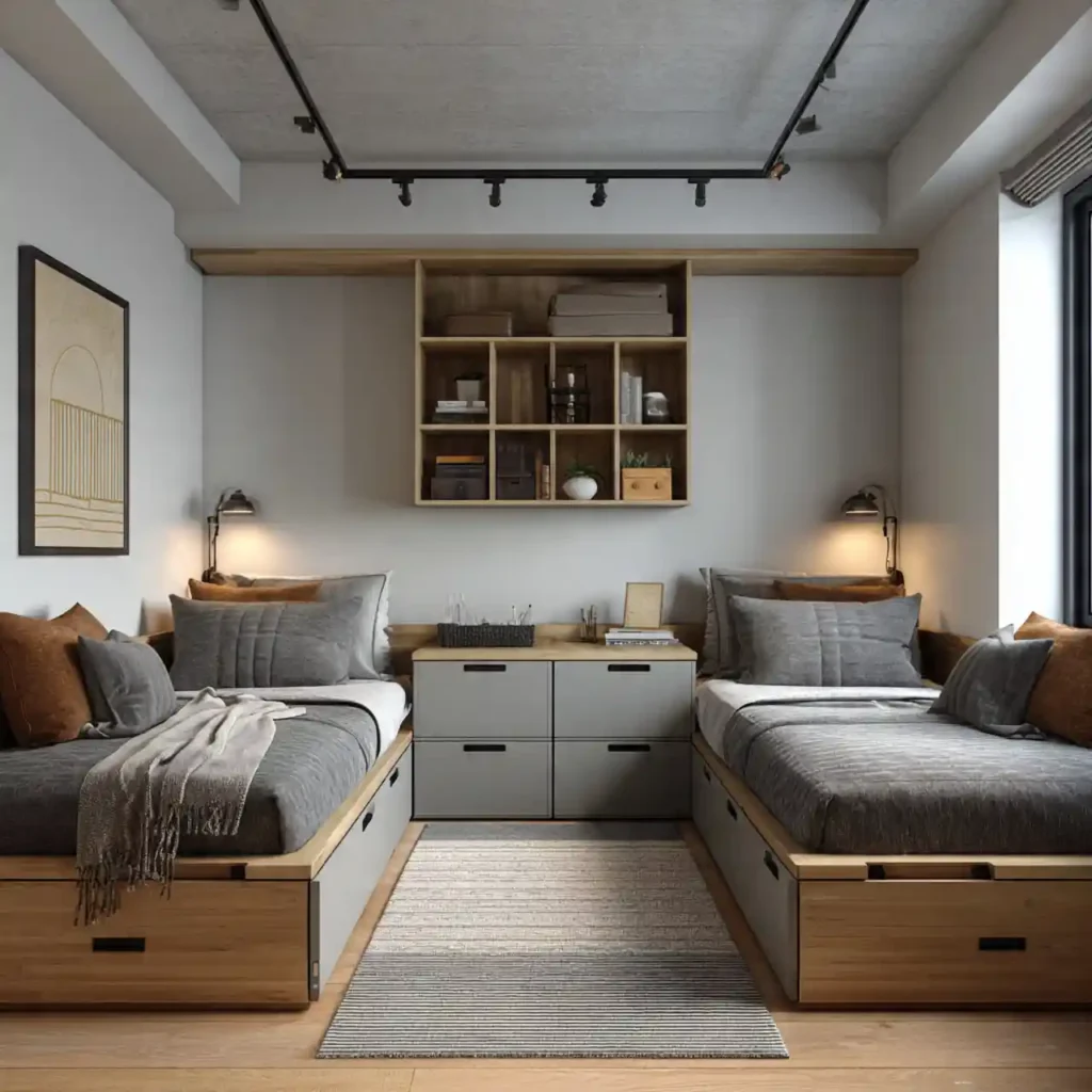 Two beds are arranged with equal storage and lighting. Each person gets personal space and function. Shelves and drawers keep items organized. The design supports harmony and balance. Perfect for siblings or roommates.