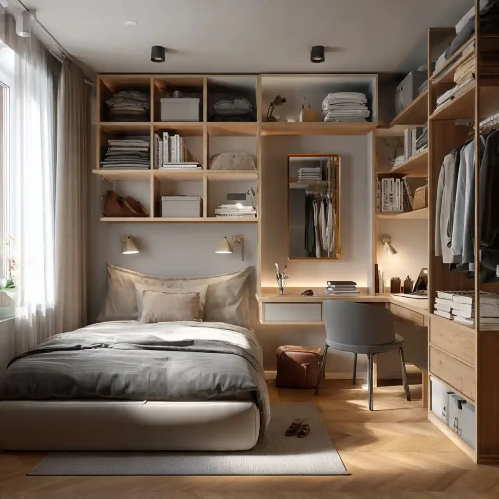 Compact furniture is arranged for maximum usability. Wall-mounted shelves replace bulky cabinets. The bed remains the main relaxing element. Storage solutions keep the room neat. Small spaces become highly practical.