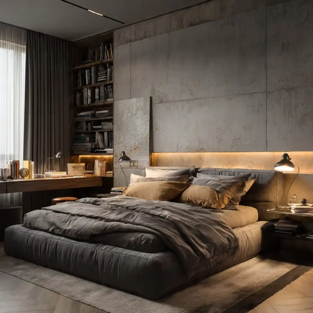 This bedroom combines sleep, work, and storage smartly. Furniture is chosen for real-life daily use. Lighting and layout support multiple activities. The bed remains cozy and central. Style and function exist in perfect balance.