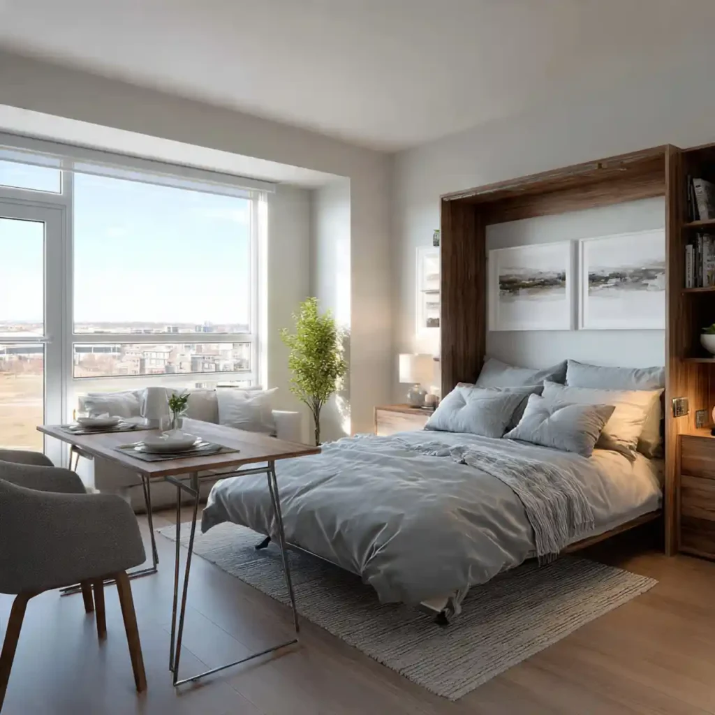 Foldable tables and chairs add extra function. They disappear when not in use. The bed stays as the main feature. Space feels open and adaptable. Perfect for small modern homes.