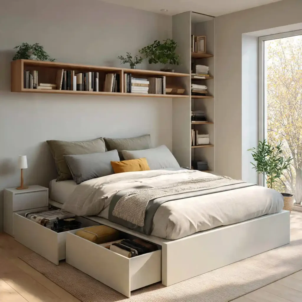 The bed includes built-in drawers underneath for smart hidden storage. Extra blankets and seasonal items stay neatly organized. The room remains clutter-free and visually clean. Simple bedside tables complete the functional layout. This bedroom uses every inch wisely.
