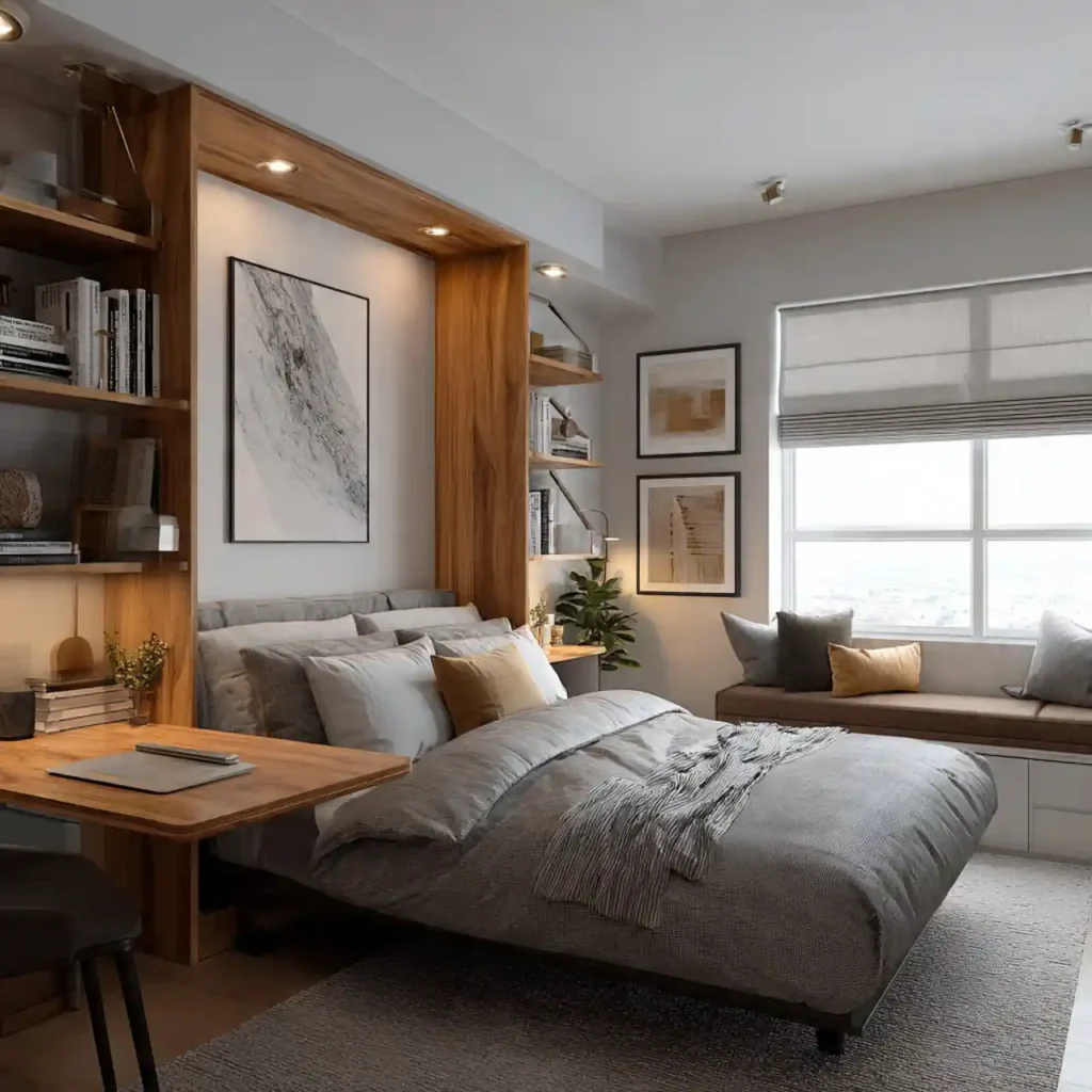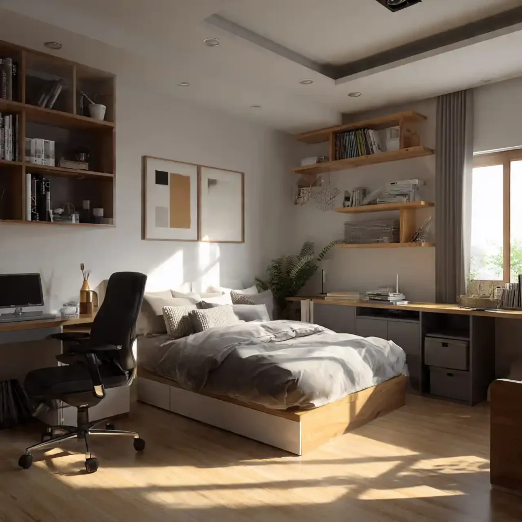 A comfortable bed is placed beside a compact study desk for daily use. The desk works as a workstation without disturbing the sleeping area. Wall shelves provide extra storage for books and accessories. Neutral colors keep the room calm and organized. This design perfectly blends rest and productivity.